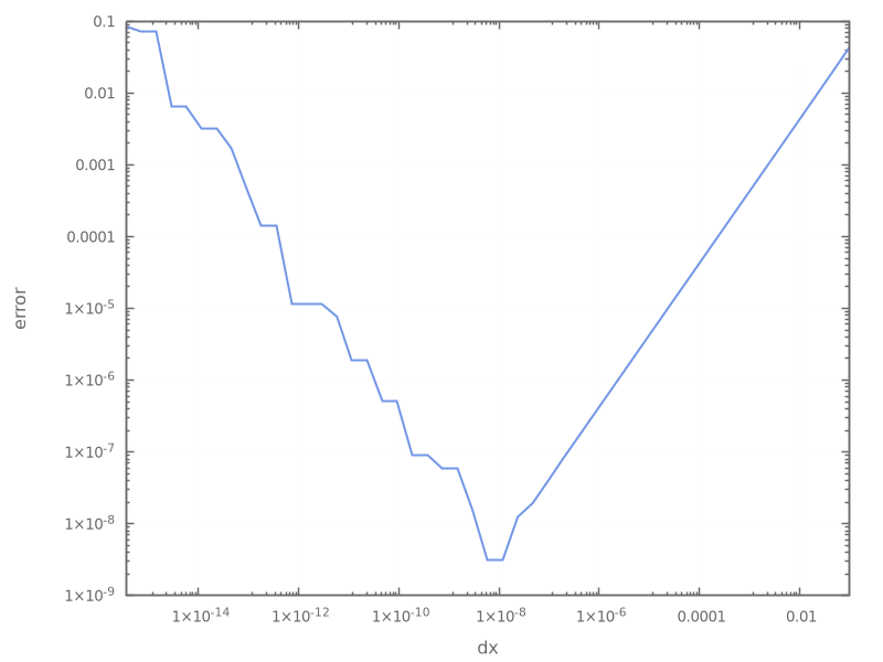 The minimum error here is around \(\sqrt{\epsilon}\), where \(\epsilon\) is machine epsilon.