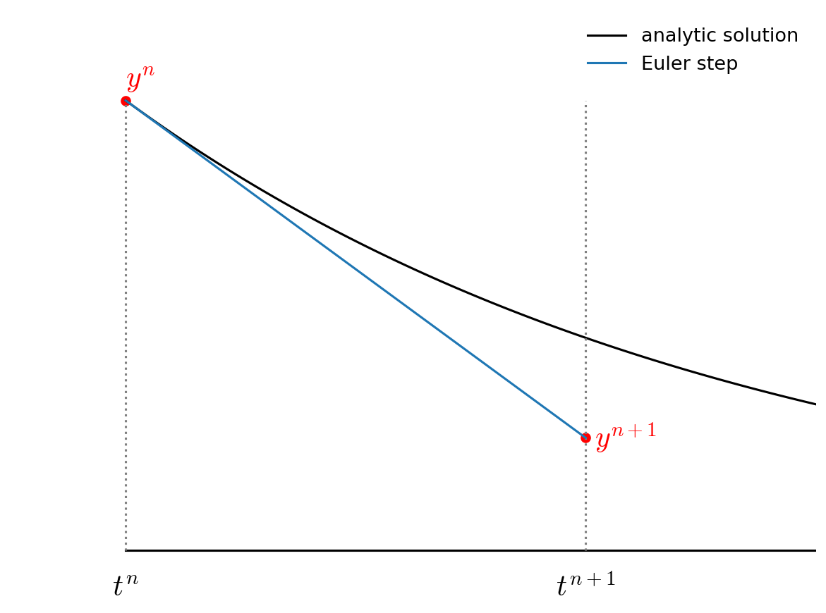Fig. 7 Euler’s method: we evaluate the slope at the start of the timestep and then follow this through to the new time.#