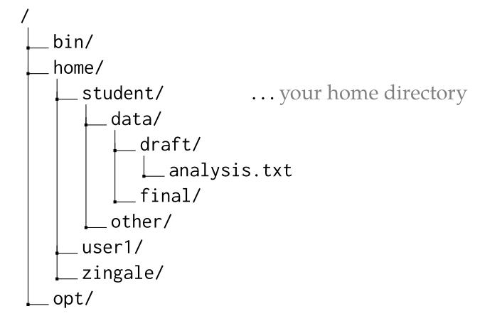 /at the top of the tree is the root directory,bin/,home/, andopt/are subdirectories beneath/, and so forth.Your username on this machine is