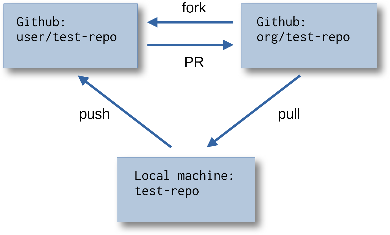 The overall workflow that we did: fork, push to our fork, issue a PR, looks like:
